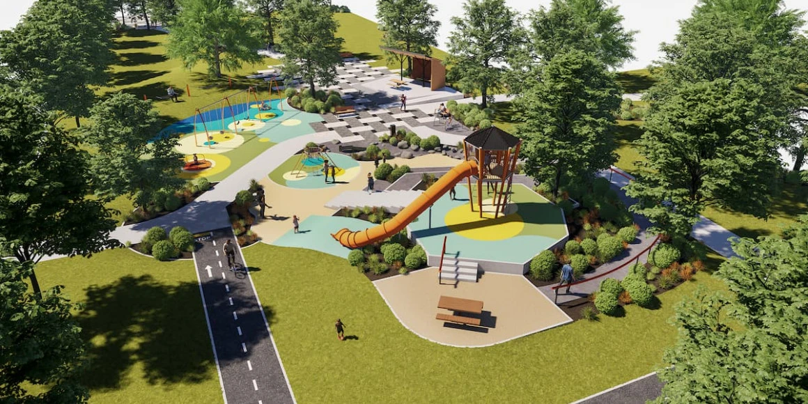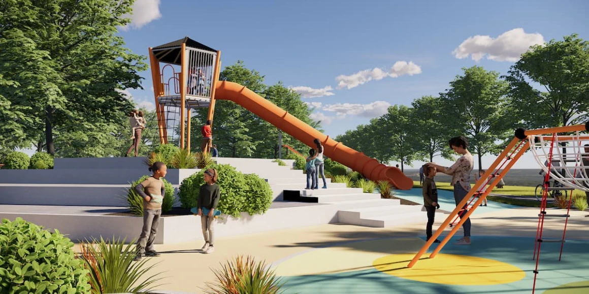 Designed by DCM Urban, planned features of the playground include a tower and tube slide, inclusive carousel, and water play area, with plenty of shelter and picnic areas. In addition to the playground, the wider reserve is set to appeal to all ages with a learn-to-ride bike track and half court with basketball hoop.